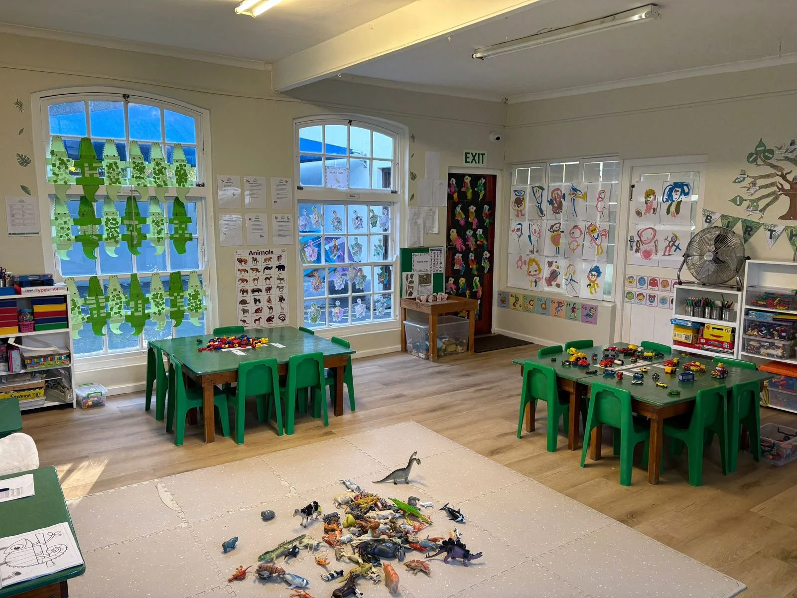 Children's classroom with green tables, chairs, and toys, including a pile of toy animals and vehicles on the floor. The walls are decorated with colorful artwork, and there are windows with paper tree and animal cutouts. Shelves with supplies are visible on either side of the room.